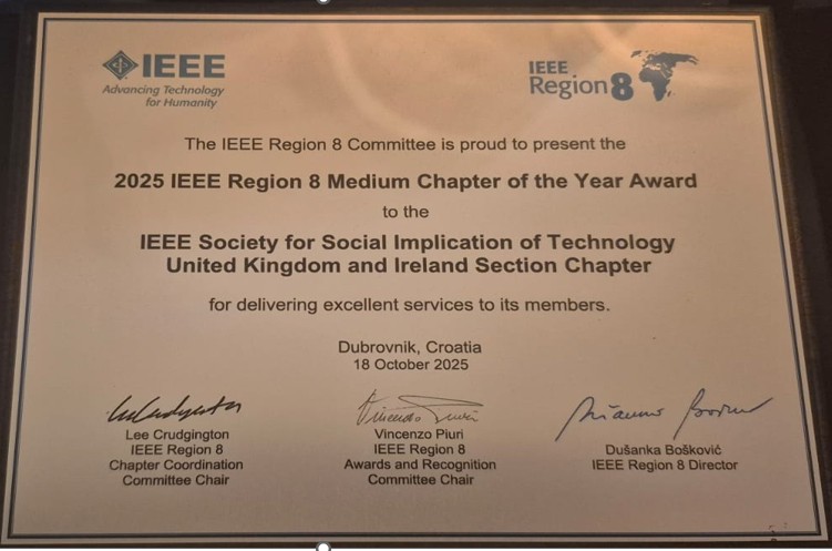 We are pleased to congratulate the IEEE UK and Ireland Society on Societal Implications of Technology (SSIT) Chapter on being awarded the 2025 IEEE Region 8 Medium Chapter of the Year Award for delivering excellent services to its members during 2024.